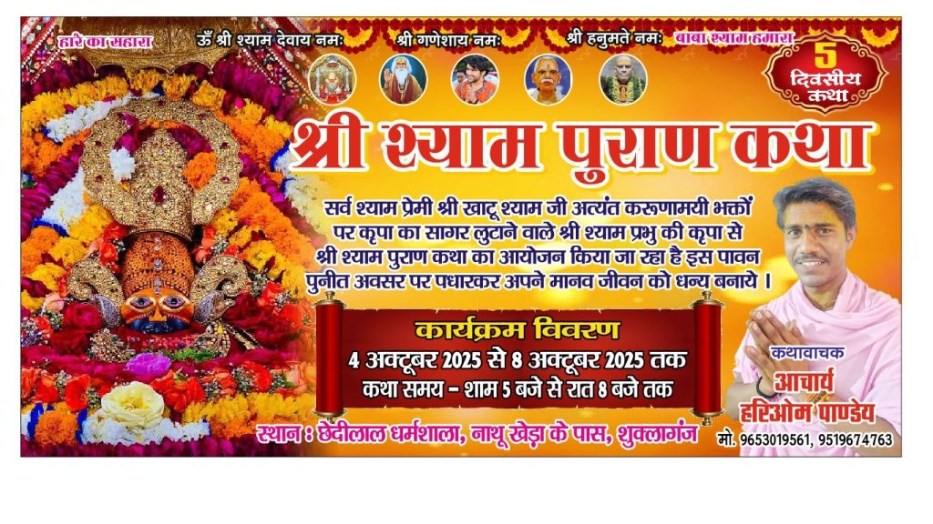 यह कथा प्रतिदिन संध्या समय 8 अक्टूबर तक आयोजित की जाएगी। हर दिन भजन संध्या, श्याम नाम संकीर्तन और विशेष प्रवचन होंगे। श्रद्धालु कथा में शामिल होकर श्याम बाबा के रहस्यमयी और अल्पज्ञात प्रसंगों की जानकारी प्राप्त कर सकेंगे।