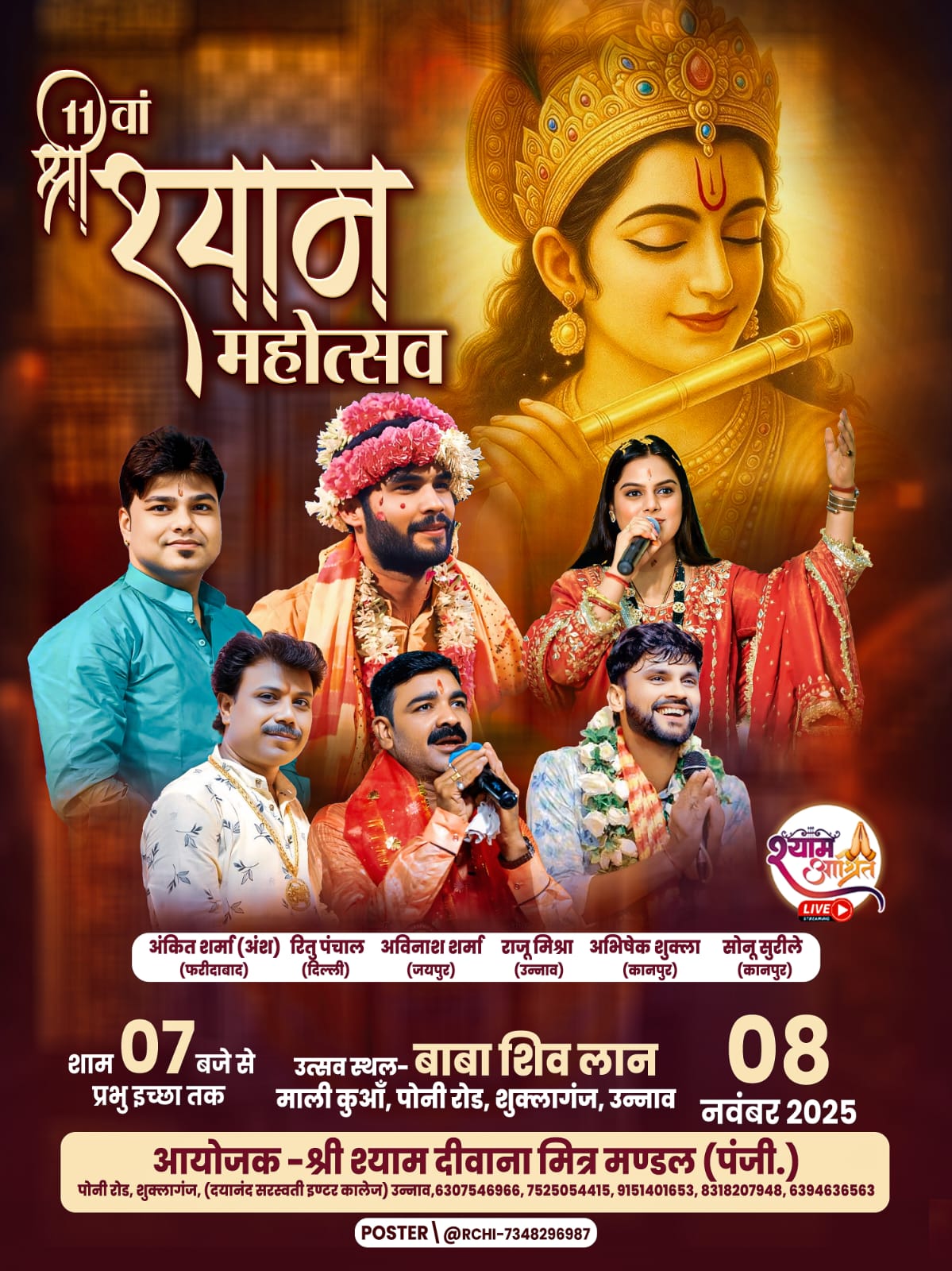 рдорд╣реЛрддреНрд╕рд╡ рдореЗрдВ рджреЗрд╢ рдХреЗ рд╡рд┐рднрд┐рдиреНрди рдкреНрд░рд╛рдВрддреЛрдВ рд╕реЗ рдЦреНрдпрд╛рддрд┐ рдкреНрд░рд╛рдкреНрдд рднрдЬрди рдкреНрд░рд╡рд╛рд╣рдХ рдПрд╡рдВ рд╢реНрдпрд╛рдо рднрдХреНрдд рдХрд▓рд╛рдХрд╛рд░ рдЙрдкрд╕реНрдерд┐рдд рд░рд╣реЗрдВрдЧреЗ, рдЬреЛ рдЕрдкрдиреЗ рдордзреБрд░ рднрдЬрдиреЛрдВ рдФрд░ рд╕рдВрдЧреАрддрдордп рдкреНрд░рд╕реНрддреБрддрд┐ рд╕реЗ рднрдХреНрддреЛрдВ рдХреЛ рднрдХреНрддрд┐ рд░рд╕ рдореЗрдВ рд╕рд░реЛрдмрд╛рд░ рдХрд░ рджреЗрдВрдЧреЗред