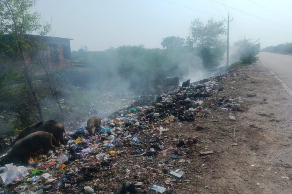 -कचरे से उठती दुर्गंध और धुएं से सांस रोक कर हाईवे गुजरते राहगीर